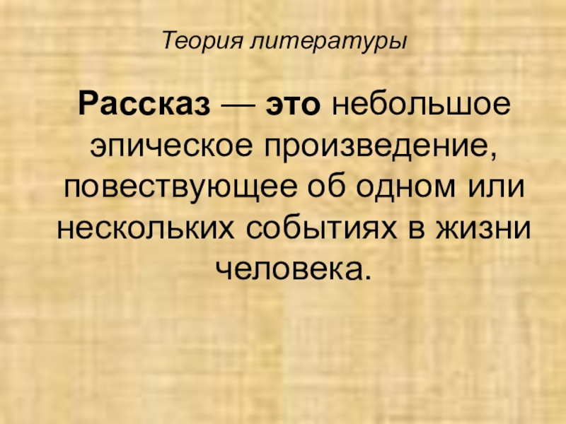 Теория литературыРассказ — это небольшое эпическое произведение, повествующее об одном или нескольких событиях в жизни человека.