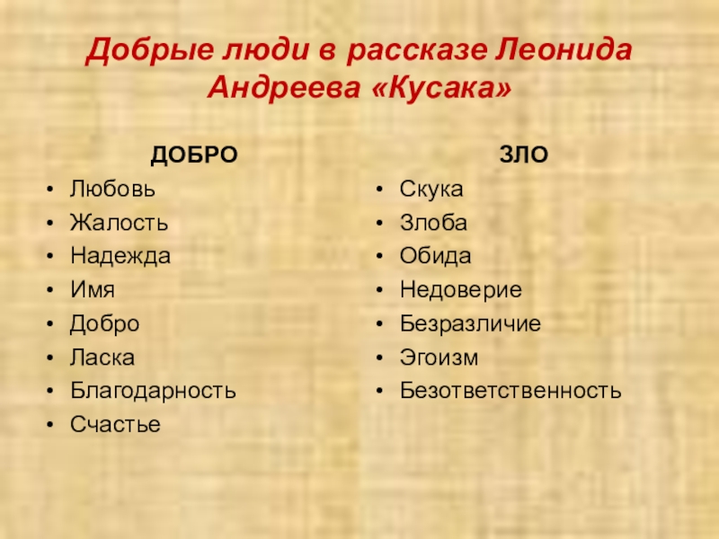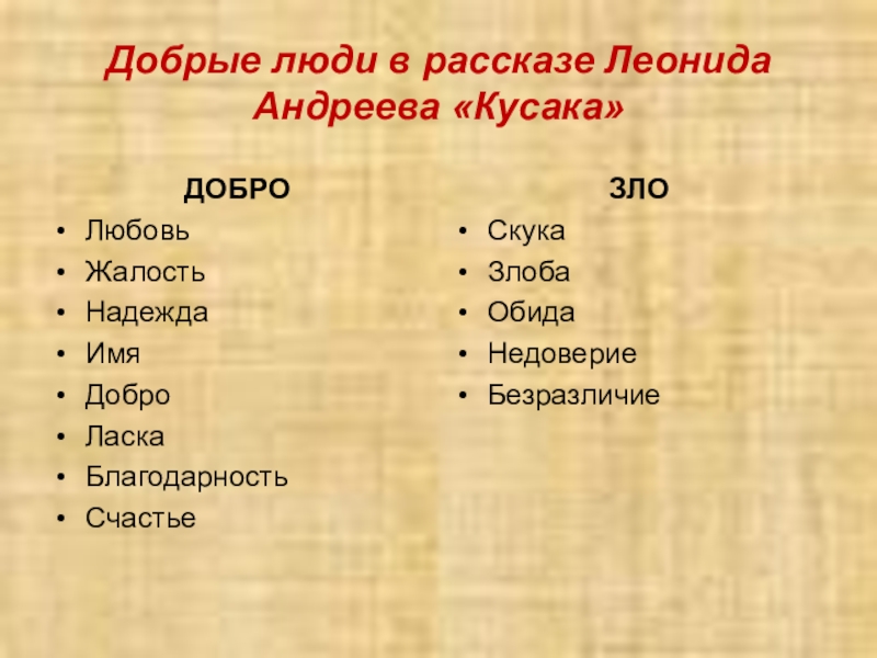 Добрые люди в рассказе Леонида Андреева «Кусака»ДОБРОЛюбовьЖалость НадеждаИмяДобро ЛаскаБлагодарностьСчастьеЗЛОСкука Злоба ОбидаНедовериеБезразличиеЭгоизмБезответственность
