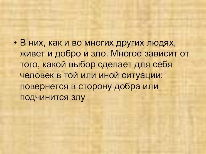 и зло. Многое зависит от того, какой выбор сделает для себя человек в той или иной ситуации: повернется в сторону добра или подчинится злу