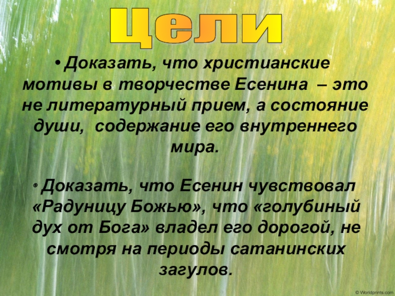Доказать, что Есенин чувствовал «Радуницу Божью», что «голубиный дух от Бога» владел его дорогой, не смотря на периоды сатанинских загулов.