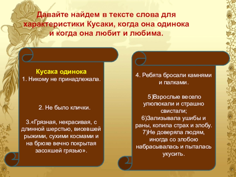 Слайд 20Давайте найдем в тексте слова для характеристики Кусаки, когда она одинока