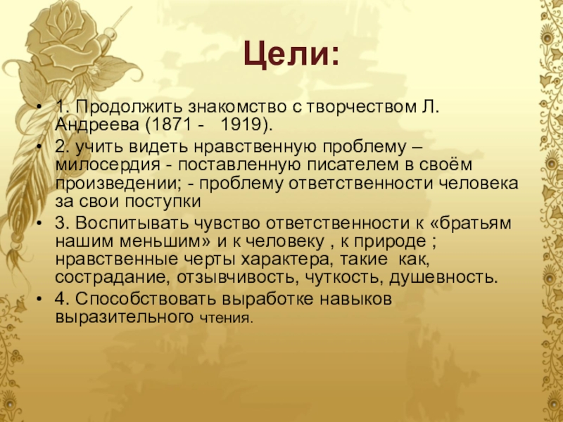 1. Продолжить знакомство с творчеством Л. Андреева (1871 - 1919).