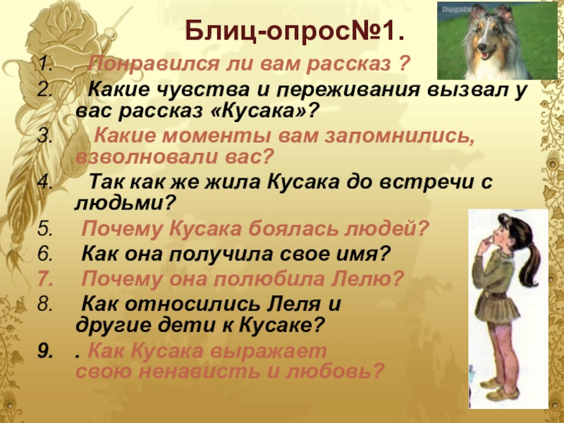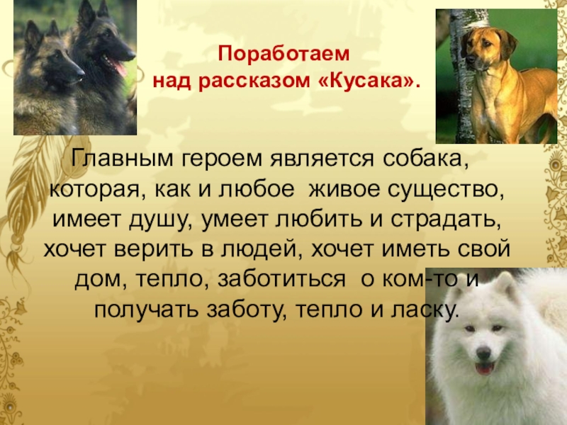 3. Воспитывать чувство ответственности к «братьям нашим меньшим» и к человеку , к природе ;нравственные черты характера, такие как, сострадание, отзывчивость, чуткость, душевность.