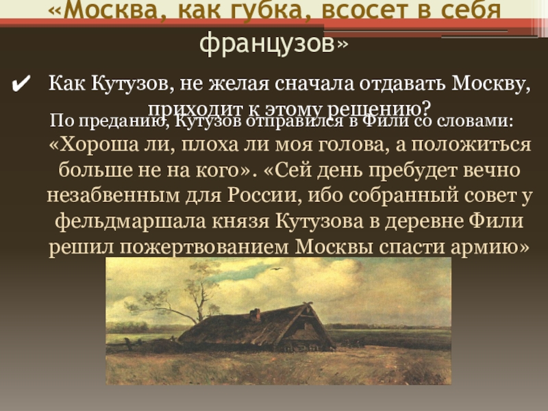 Как Кутузов, не желая сначала отдавать Москву, приходит к этому решению?