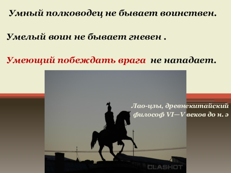 Он знал и старческим умом понимал, что руководить сотнями тысяч человек, борющихся с смертью, нельзя одному человеку, и знал, что решают участь сраженья не распоряжения главнокомандующего, не место, на котором стоят войска, не количество пушек и убитых людей, а та неуловимая сила, называемая духом войска, и он следил за этой силой и руководил ею, насколько это было в его власти. (Л. Н. Толстой)