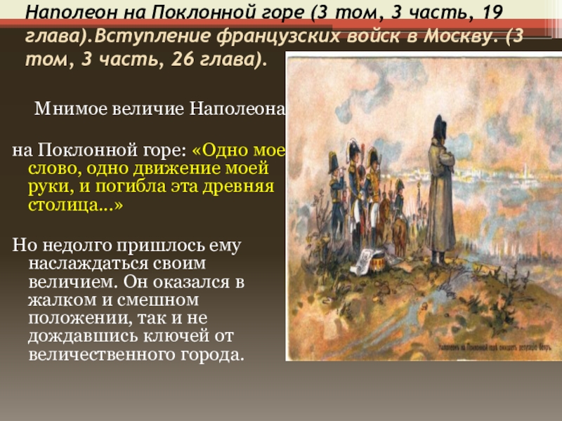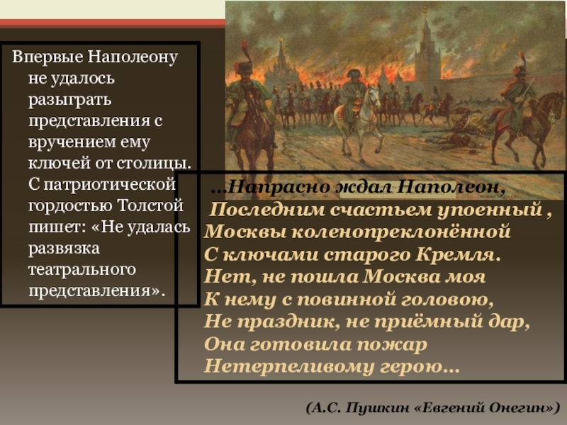 Впервые Наполеону не удалось разыграть представления с вручением ему ключей от столицы. С патриотической гордостью Толстой пишет: «Не удалась развязка театрального представления».