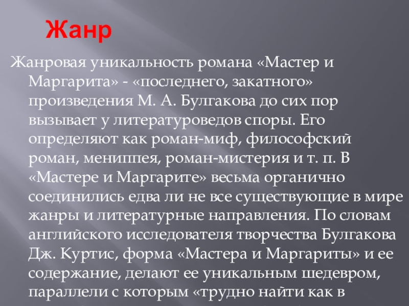 Жанровая уникальность романа «Мастер и Маргарита» - «последнего, закатного» произведения