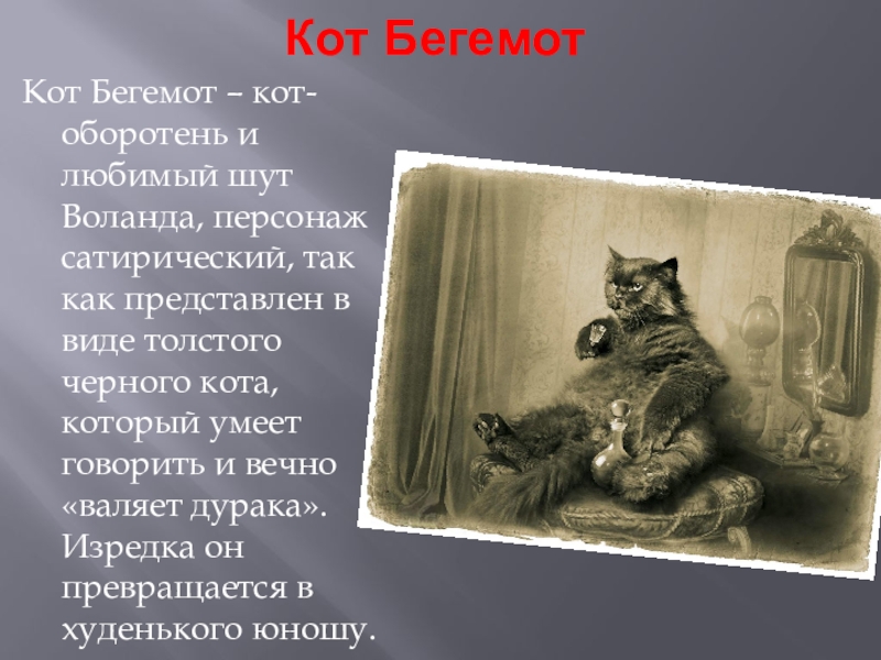 Кот Бегемот – кот-оборотень и любимый шут Воланда, персонаж сатирический,