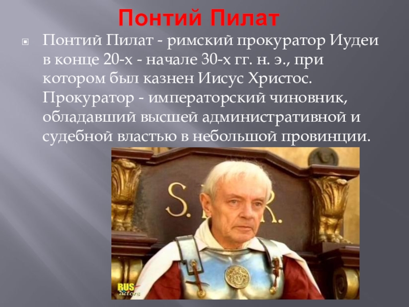 начале 30-х гг. н. э., при котором был казнен Иисус Христос. Прокуратор - императорский чиновник, обладавший высшей административной и судебной властью в небольшой провинции.