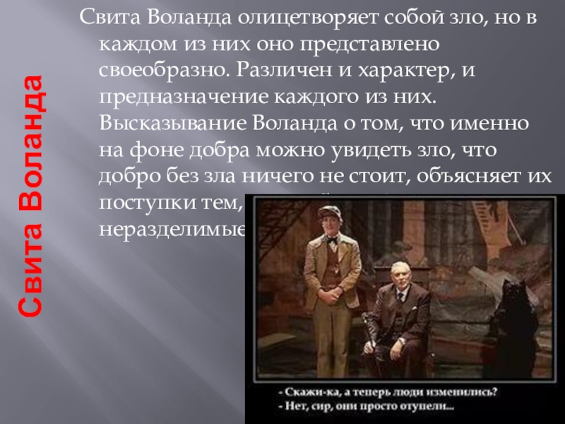 Свита Воланда олицетворяет собой зло, но в каждом из