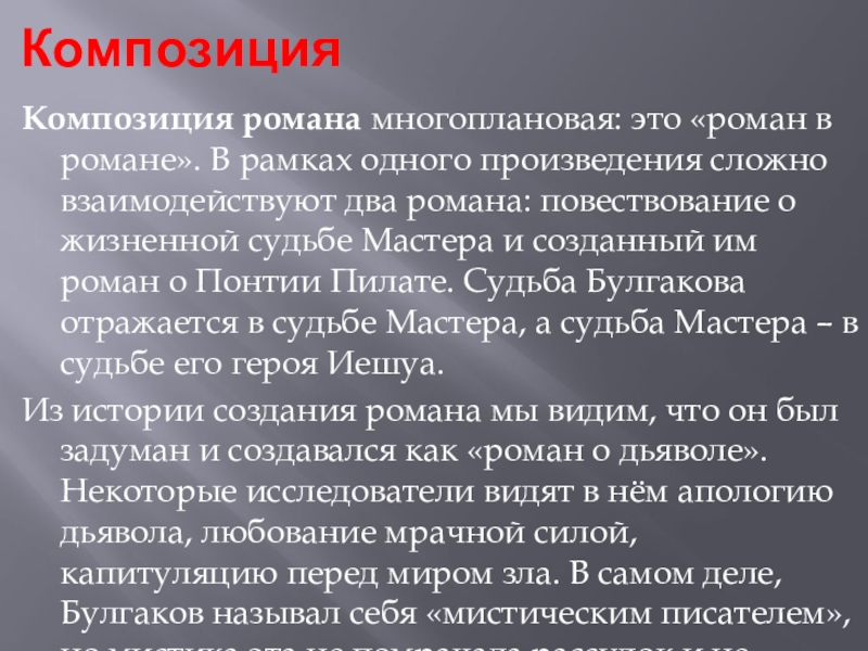 произведения сложно взаимодействуют два романа: повествование о жизненной судьбе Мастера и созданный им роман о Понтии Пилате. Судьба Булгакова отражается в судьбе Мастера, а судьба Мастера – в судьбе его героя Иешуа.