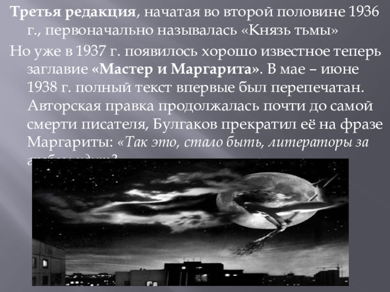 Но уже в 1937 г. появилось хорошо известное теперь заглавие «Мастер и Маргарита». В мае – июне 1938 г. полный текст впервые был перепечатан. Авторская правка продолжалась почти до самой смерти писателя, Булгаков прекратил её на фразе Маргариты: «Так это, стало быть, литераторы за гробом идут?»…