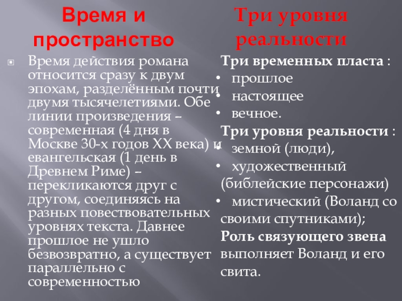 разделённым почти двумя тысячелетиями. Обе линии произведения – современная (4 дня в Москве 30-х годов XX века) и евангельская (1 день в Древнем Риме) – перекликаются друг с другом, соединяясь на разных повествовательных уровнях текста. Давнее прошлое не ушло безвозвратно, а существует параллельно с современностью