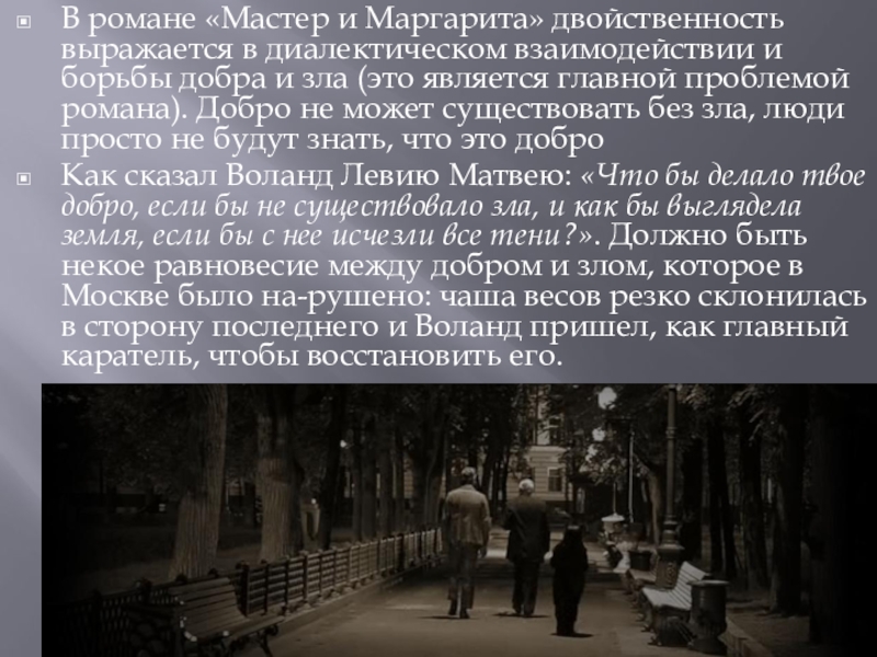 Слайд 9В романе «Мастер и Маргарита» двойственность выражается в диалектическом взаимодействии и