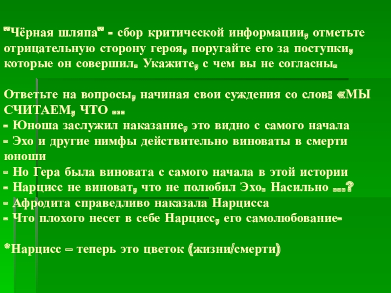 Слайд 15"Чёрная шляпа" - сбор критической информации, отметьте отрицательную сторону героя, поругайте его