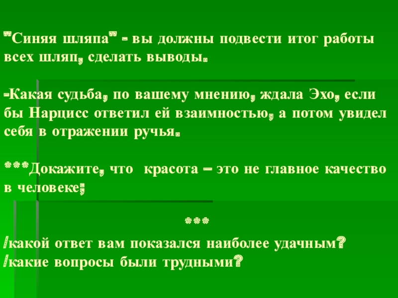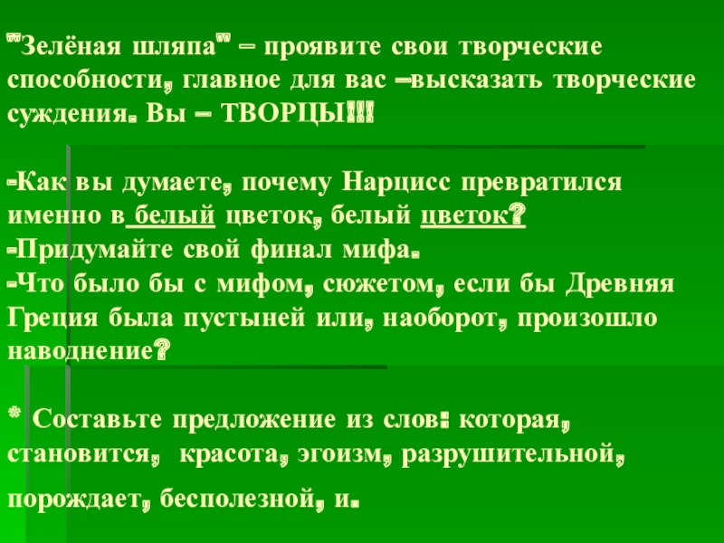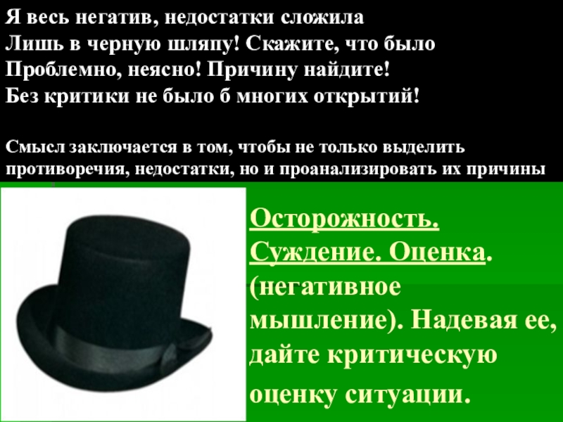 Слайд 17"Зелёная шляпа" – проявите свои творческие способности, главное для вас –высказать творческие