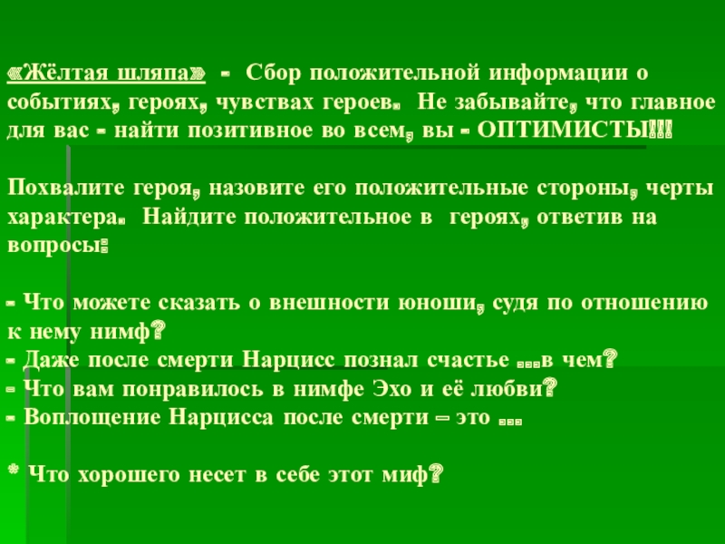 Слайд 16«Жёлтая шляпа» - Сбор положительной информации о событиях, героях, чувствах героев.