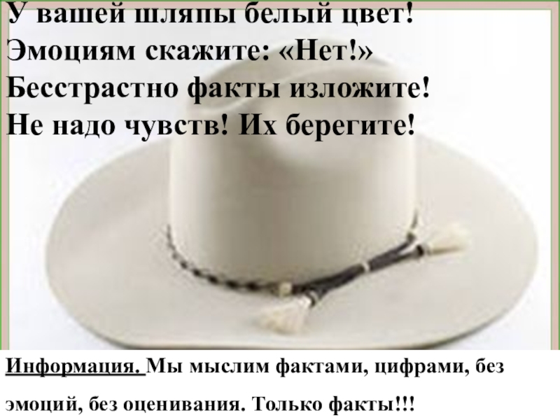 Слайд 13Белая шляпа - точно и конкретно вы называете только точные даты,