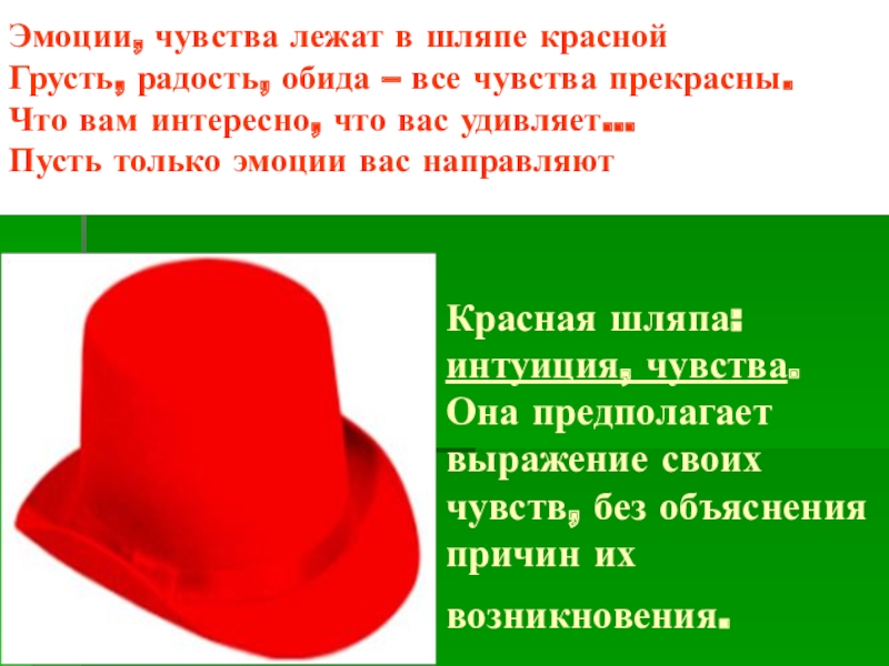 Слайд 8Красная шляпа: интуиция, чувства. Она предполагает выражение своих чувств, без объяснения