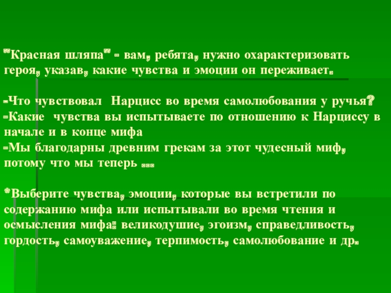 *Выберите чувства, эмоции, которые вы встретили по содержанию мифа или испытывали во время чтения и осмысления мифа: великодушие, эгоизм, справедливость, гордость, самоуважение, терпимость, самолюбование и др.