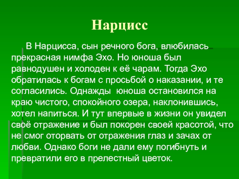 прекрасная нимфа Эхо. Но юноша был равнодушен и холоден к её чарам. Тогда Эхо обратилась к богам с просьбой о наказании, и те согласились. Однажды юноша остановился на краю чистого, спокойного озера, наклонившись, хотел напиться. И тут впервые в жизни он увидел своё отражение и был покорен своей красотой, что не смог оторвать от отражения глаз и зачах от любви. Однако боги не дали ему погибнуть и превратили его в прелестный цветок.