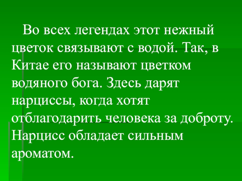 нежный цветок связывают с водой. Так, в Китае его называют цветком водяного бога. Здесь дарят нарциссы, когда хотят отблагодарить человека за доброту. Нарцисс обладает сильным ароматом.