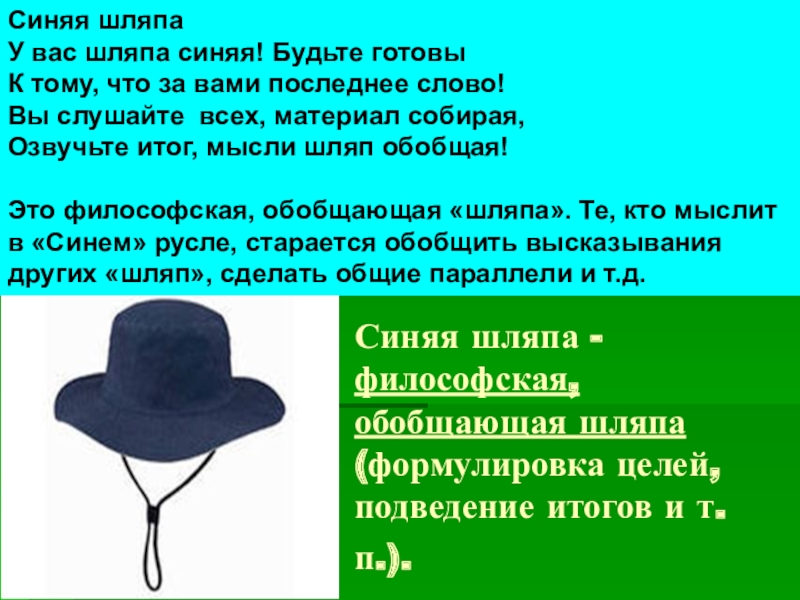 Слайд 12Синяя шляпа - философская, обобщающая шляпа (формулировка целей, подведение итогов и