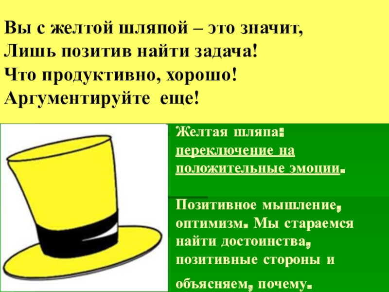 Слайд 10Желтая шляпа: переключение на положительные эмоции.