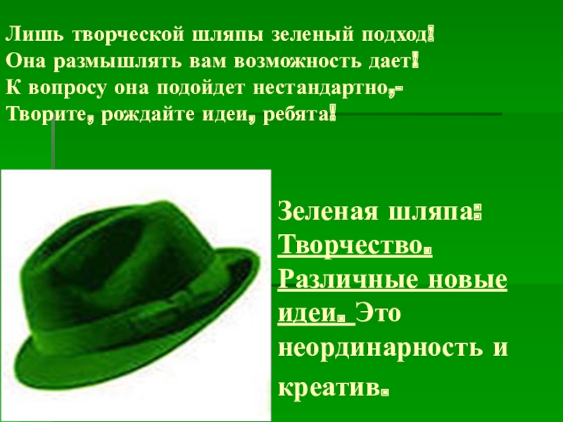 Слайд 11Зеленая шляпа: Творчество. Различные новые идеи. Это неординарность и креатив.