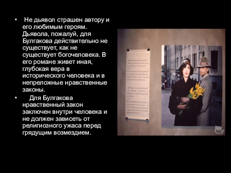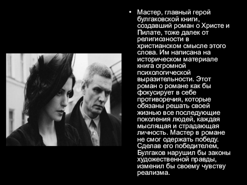 тоже далек от религиозности в христианском смысле этого слова. Им написана на историческом материале книга огромной психологической выразительности. Этот роман о романе как бы фокусирует в себе противоречия, которые обязаны решать своей жизнью все последующие поколения людей, каждая мыслящая и страдающая личность. Мастер в романе не смог одержать победу. Сделав его победителем, Булгаков нарушил бы законы художественной правды, изменил бы своему чувству реализма.