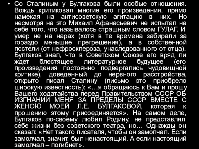 произведения, прямо намекая на антисоветскую агитацию в них. Но несмотря на это Михаил Афанасьевич не испытал на себе того, что называлось страшным словом ГУЛАГ. И умер не на нарах (хотя в те времена забирали за гораздо меньшие прегрешения), а в собственной постели (от нефросклероза, унаследованного от отца). Булгаков знал, что в Советском Союзе его вряд ли ждет блестящее литературное будущее (его произведения постоянно подвергались чудовищной критике), доведенный до нервного расстройства, открыто писал Сталину (письмо это приобрело широкую известность): «…я обращаюсь к Вам и прошу Вашего ходатайства перед Правительством СССР ОБ ИЗГНАНИИ МЕНЯ ЗА ПРЕДЕЛЫ СССР ВМЕСТЕ С ЖЕНОЮ МОЕЙ Л.Е. БУЛГАКОВОЙ, которая к прошению этому присоединяется». На самом деле, Булгаков по-своему любил Родину, не представлял себе жизни без советского театра, но… Однажды он сказал: «Нет такого писателя, чтобы он замолчал. Если замолчал, значит, был ненастоящий. А если настоящий замолчал – погибнет».