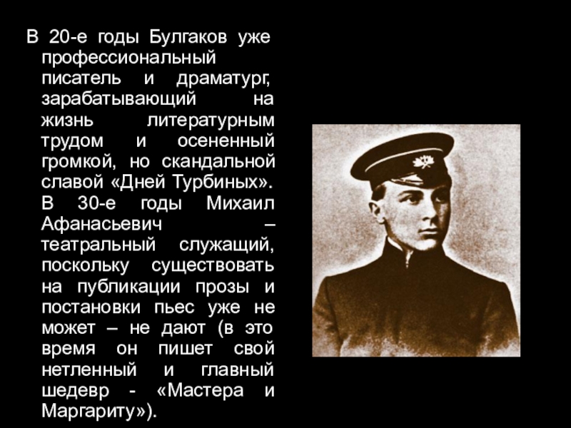 на жизнь литературным трудом и осененный громкой, но скандальной славой «Дней Турбиных». В 30-е годы Михаил Афанасьевич – театральный служащий, поскольку существовать на публикации прозы и постановки пьес уже не может – не дают (в это время он пишет свой нетленный и главный шедевр - «Мастера и Маргариту»).