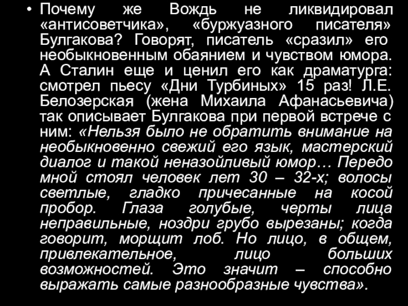 «сразил» его необыкновенным обаянием и чувством юмора. А Сталин еще и ценил его как драматурга: смотрел пьесу «Дни Турбиных» 15 раз! Л.Е. Белозерская (жена Михаила Афанасьевича) так описывает Булгакова при первой встрече с ним: «Нельзя было не обратить внимание на необыкновенно свежий его язык, мастерский диалог и такой неназойливый юмор… Передо мной стоял человек лет 30 – 32-х; волосы светлые, гладко причесанные на косой пробор. Глаза голубые, черты лица неправильные, ноздри грубо вырезаны; когда говорит, морщит лоб. Но лицо, в общем, привлекательное, лицо больших возможностей. Это значит – способно выражать самые разнообразные чувства».