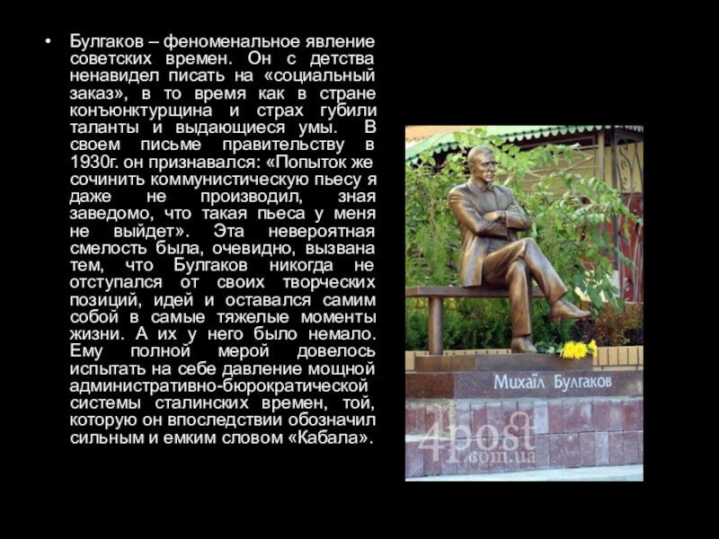на «социальный заказ», в то время как в стране конъюнктурщина и страх губили таланты и выдающиеся умы. В своем письме правительству в 1930г. он признавался: «Попыток же сочинить коммунистическую пьесу я даже не производил, зная заведомо, что такая пьеса у меня не выйдет». Эта невероятная смелость была, очевидно, вызвана тем, что Булгаков никогда не отступался от своих творческих позиций, идей и оставался самим собой в самые тяжелые моменты жизни. А их у него было немало. Ему полной мерой довелось испытать на себе давление мощной административно-бюрократической системы сталинских времен, той, которую он впоследствии обозначил сильным и емким словом «Кабала».
