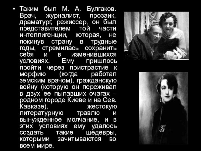 был представителем той части интеллигенции, которая, не покинув страну в трудные годы, стремилась сохранить себя и в изменившихся условиях. Ему пришлось пройти через пристрастие к морфию (когда работал земским врачом), гражданскую войну (которую он переживал в двух ее пылавших очагах – родном городе Киеве и на Сев. Кавказе), жестокую литературную травлю и вынужденное молчание, и в этих условиях ему удалось создать такие шедевры, которыми зачитываются во всем мире.