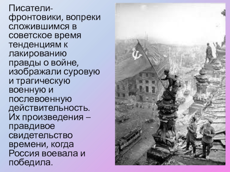 Слайд 29Писатели-фронтовики, вопреки сложившимся в советское время тенденциям к лакированию правды о