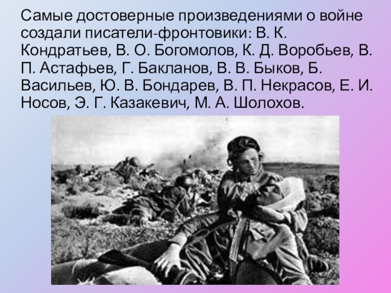 Слайд 28Самые достоверные произведениями о войне создали писатели-фронтовики: В. К. Кондратьев, В.