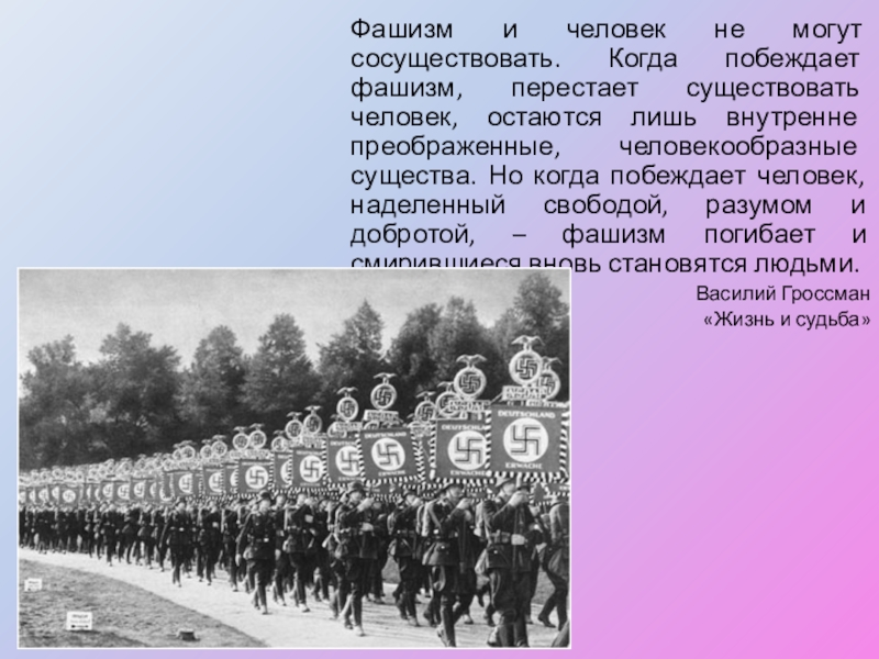 Слайд 2Фашизм и человек не могут сосуществовать. Когда побеждает фашизм, перестает существовать