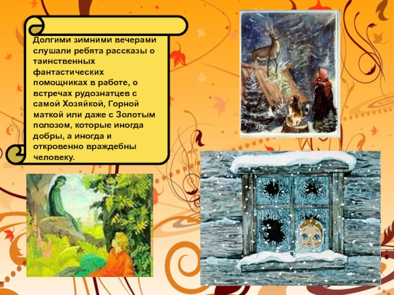 Долгими зимними вечерами слушали ребята рассказы о таинственных фантастических помощниках в работе, о встречах рудознатцев с самой Хозяйкой, Горной маткой или даже с Золотым полозом, которые иногда добры, а иногда и откровенно враждебны человеку.