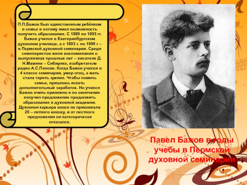 П.П.Бажов был единственным ребёнком в семье и потому имел возможность получить образование. С 1889 по 1893 гг. Бажов учился в Екатеринбургском духовном училище, а с 1893 г. по 1899 г – в Пермской духовной семинарии. Среди семинаристов жили воспоминания о выпускниках прошлых лет – писателе Д.Н.Мамине – Сибиряке, изобретателе радио А.С.Попове. Когда Бажов учился в 4 классе семинарии, умер отец, а мать стала терять зрение. Чтобы помочь семье, пришлось искать дополнительный заработок. Но учился Бажов очень прилежно и по окончании получил предложение продолжить образование в духовной академии. Духовная карьера вовсе не привлекала 20 – летнего юношу, и от лестного предложения он категорически отказался.