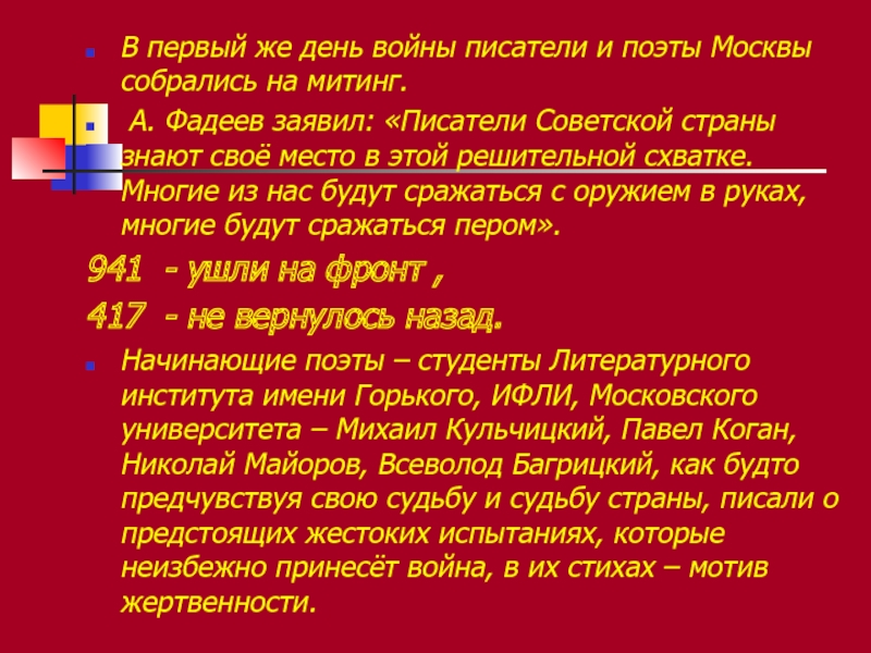 Начинающие поэты – студенты Литературного института имени Горького, ИФЛИ, Московского университета – Михаил Кульчицкий, Павел Коган, Николай Майоров, Всеволод Багрицкий, как будто предчувствуя свою судьбу и судьбу страны, писали о предстоящих жестоких испытаниях, которые неизбежно принесёт война, в их стихах – мотив жертвенности.