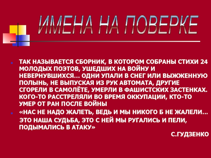 Слайд 16ТАК НАЗЫВАЕТСЯ СБОРНИК, В КОТОРОМ СОБРАНЫ СТИХИ 24 МОЛОДЫХ ПОЭТОВ, УШЕДШИХ