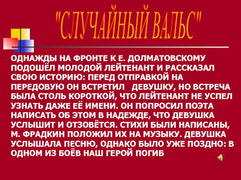 СВОЮ ИСТОРИЮ: ПЕРЕД ОТПРАВКОЙ НА ПЕРЕДОВУЮ ОН ВСТРЕТИЛ ДЕВУШКУ, НО ВСТРЕЧА БЫЛА СТОЛЬ КОРОТКОЙ, ЧТО ЛЕЙТЕНАНТ НЕ УСПЕЛ УЗНАТЬ ДАЖЕ ЕЁ ИМЕНИ. ОН ПОПРОСИЛ ПОЭТА НАПИСАТЬ ОБ ЭТОМ В НАДЕЖДЕ, ЧТО ДЕВУШКА УСЛЫШИТ И ОТЗОВЁТСЯ. СТИХИ БЫЛИ НАПИСАНЫ, М. ФРАДКИН ПОЛОЖИЛ ИХ НА МУЗЫКУ. ДЕВУШКА УСЛЫШАЛА ПЕСНЮ, ОДНАКО БЫЛО УЖЕ ПОЗДНО: В ОДНОМ ИЗ БОЁВ НАШ ГЕРОЙ ПОГИБ