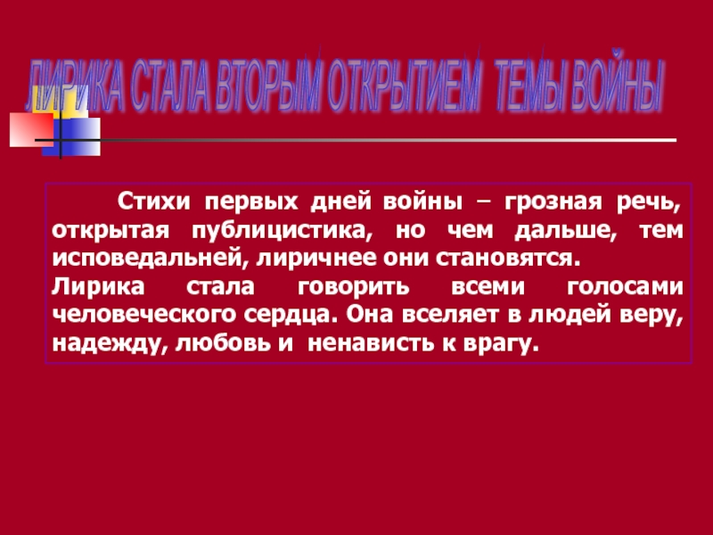 Слайд 6ЛИРИКА СТАЛА ВТОРЫМ ОТКРЫТИЕМ ТЕМЫ ВОЙНЫ