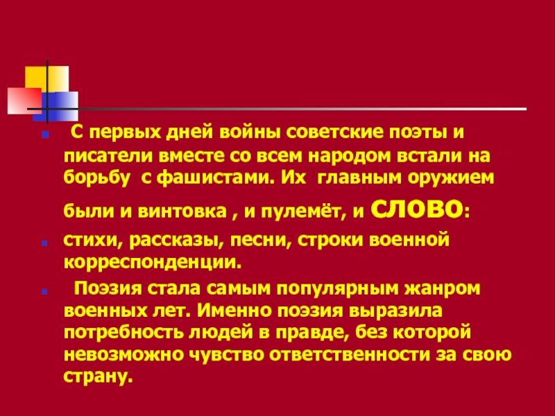 Поэзия стала самым популярным жанром военных лет. Именно поэзия выразила потребность людей в правде, без которой невозможно чувство ответственности за свою страну.