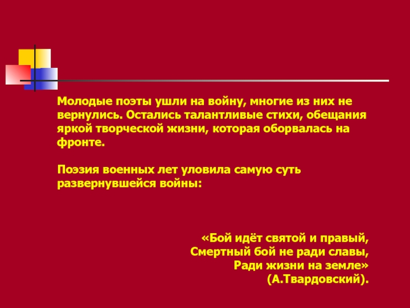 Слайд 25Молодые поэты ушли на войну, многие из них не вернулись. Остались