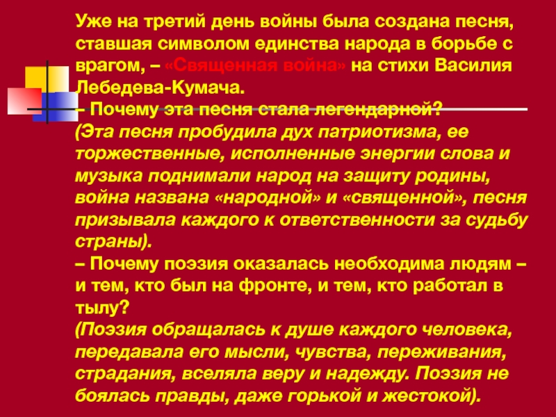 (Эта песня пробудила дух патриотизма, ее торжественные, исполненные энергии слова и музыка поднимали народ на защиту родины, война названа «народной» и «священной», песня призывала каждого к ответственности за судьбу страны).