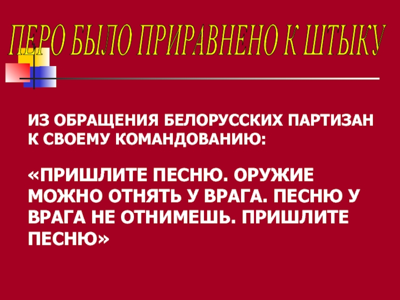 «ПРИШЛИТЕ ПЕСНЮ. ОРУЖИЕ МОЖНО ОТНЯТЬ У ВРАГА. ПЕСНЮ У ВРАГА НЕ ОТНИМЕШЬ. ПРИШЛИТЕ ПЕСНЮ»