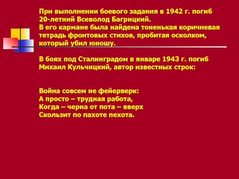 В боях под Сталинградом в январе 1943 г. погиб Михаил Кульчицкий, автор известных строк: