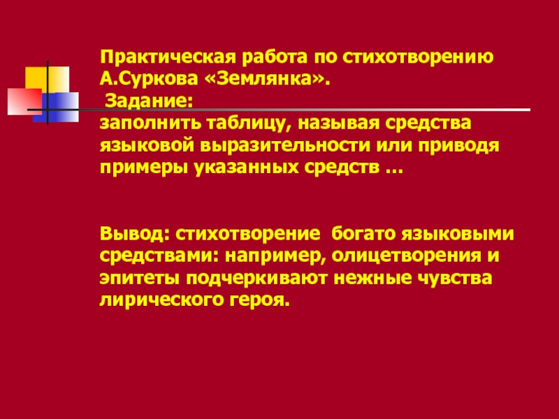 Слайд 13Практическая работа по стихотворению А.Суркова «Землянка».